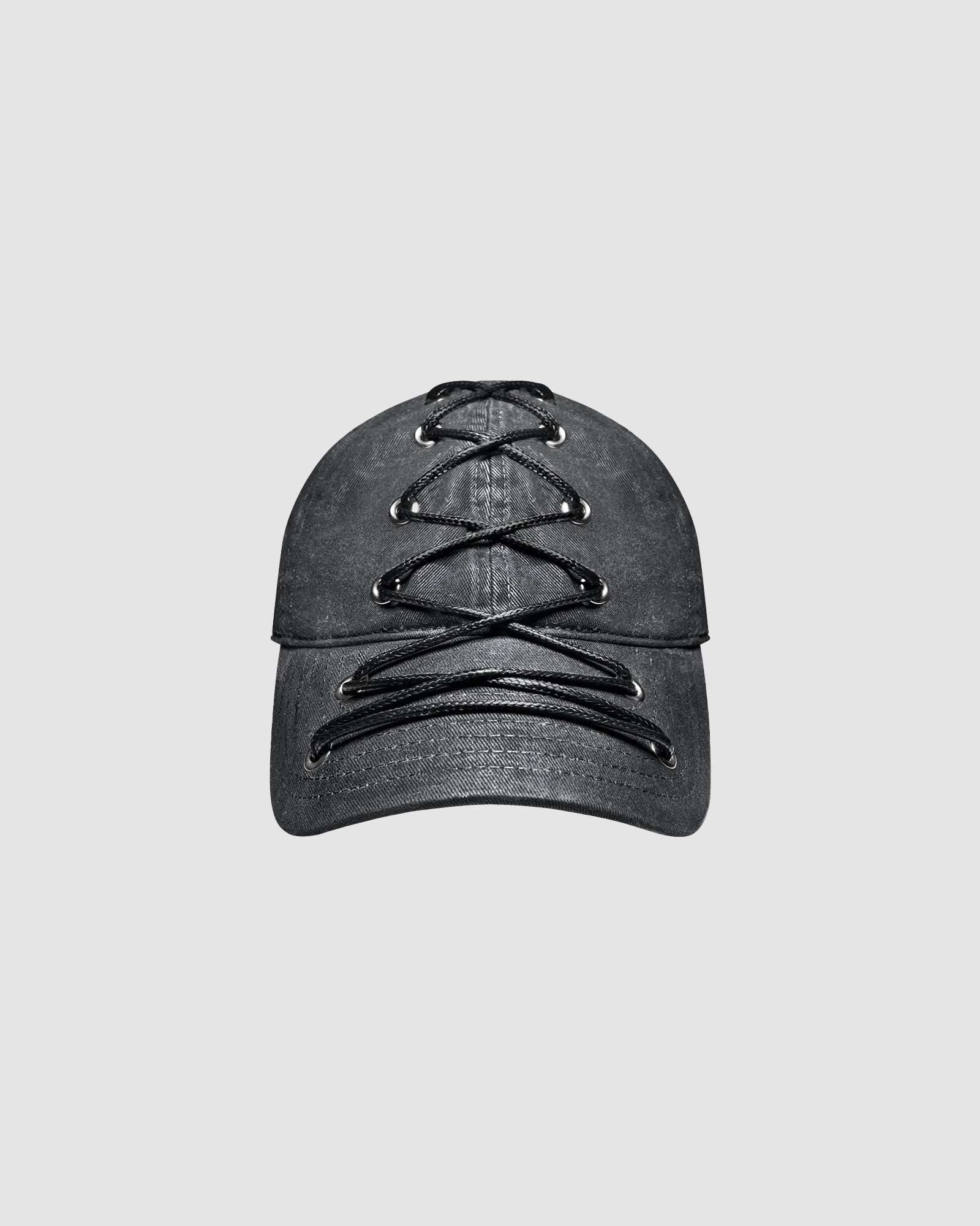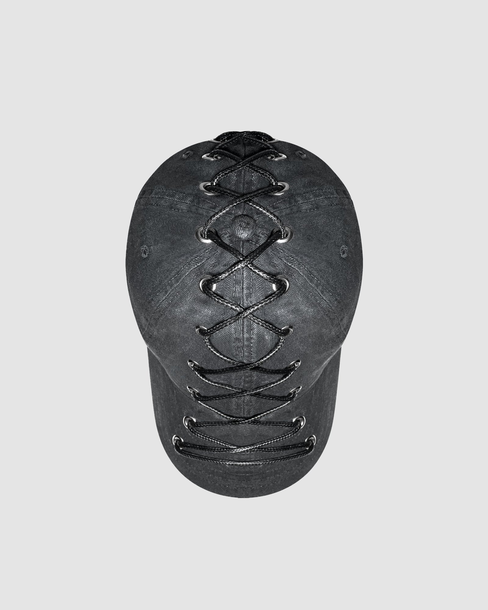 Spring/Summer 25 Black waxed cap with a bold waxed cord running through metal eyelets all around.